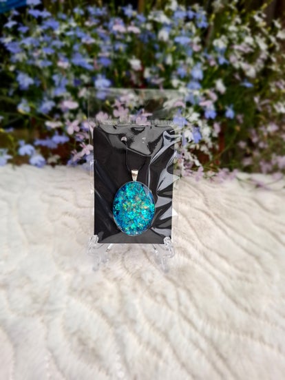 A beautiful silver plated oval shaped necklace. This necklace is handmade with resin and a beautiful blue/green craft foil. The necklace comes with a long rope necklace.