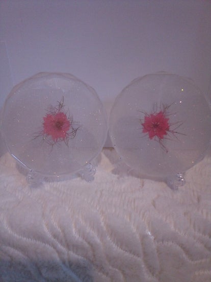 A beautiful set of two coasters. These coasters are handmade with clear resin and glitter with a pink flower design in the center.