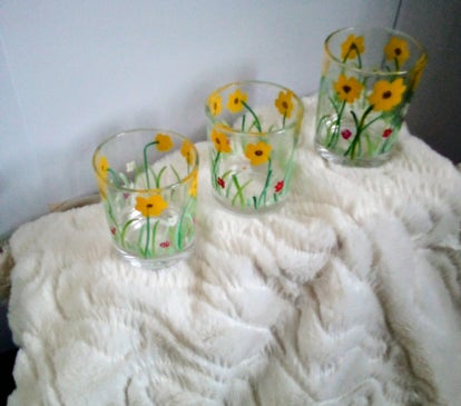 Three Decorative glasses, beautiful design of yellow flowers surrounded by grass. A set of three,a small tea light would give a beautiful glow.