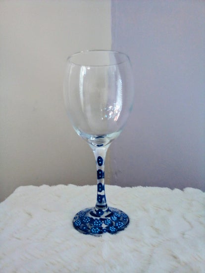 A lovely wine glass with a blue decorative design on the stem and base, this glass has a varnish finish. The design a blue/white flower. This glass is not dishwasher proof.