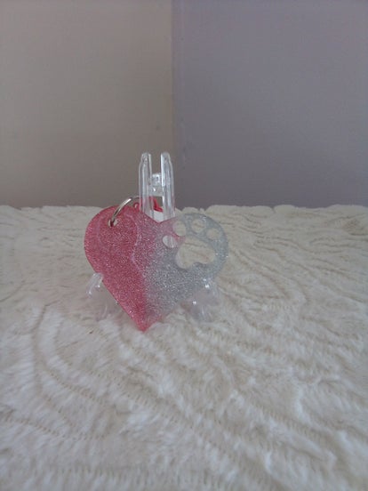 Homemade heart shaped paw print keyring. Two amazing colours pink and grey glitter. Great gift for a dog lover .