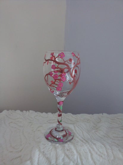 Wine glass with a beautiful blossom tree design. The design covers the glass falling round the stem and base. This decorative glass is not dishwasher proof.
