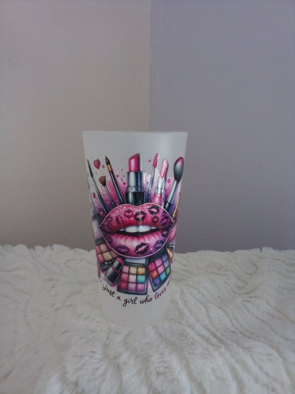 A clear plastic tumbler with a very cute design with a just a girl who loves makeup.