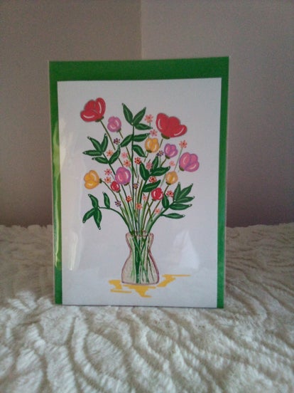 This birthday card is handmade, the card was made with acrylic paints. The card is a vase filled with beautiful flowers. The card inside is blank for you to write your own message.