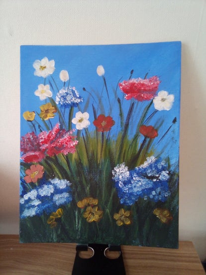 A thin canvas acrylic painting of a beautiful field of flowers surrounding by a beautiful blue sky setting
