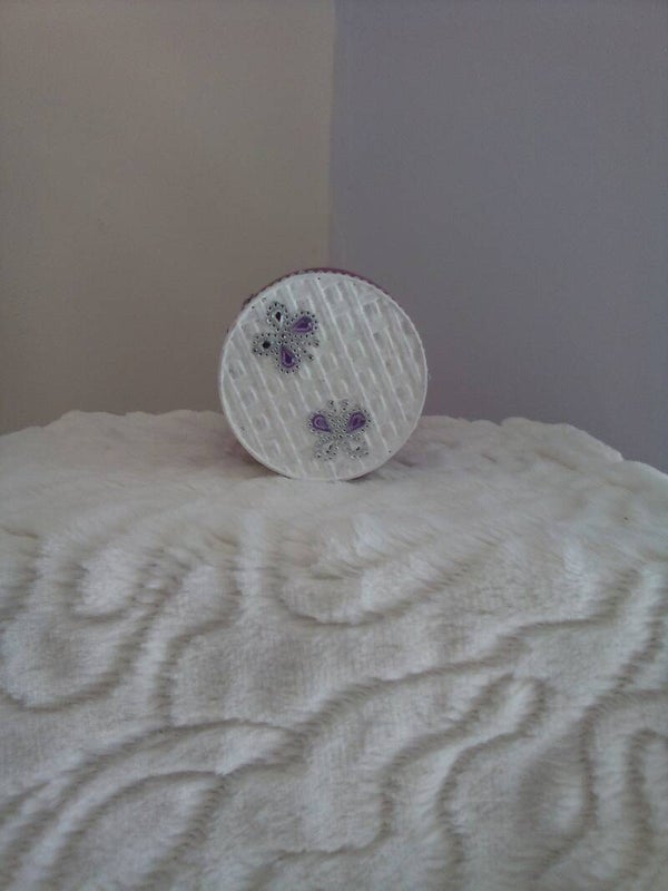 This jar is handmade with acrylic paints with a white lid. This jar is purple/pink/red/white colours. The jar is decorated with butterflies around the jar, two gem butterflies on the lid. The jar has a gem rim around the lid and around the bottom.