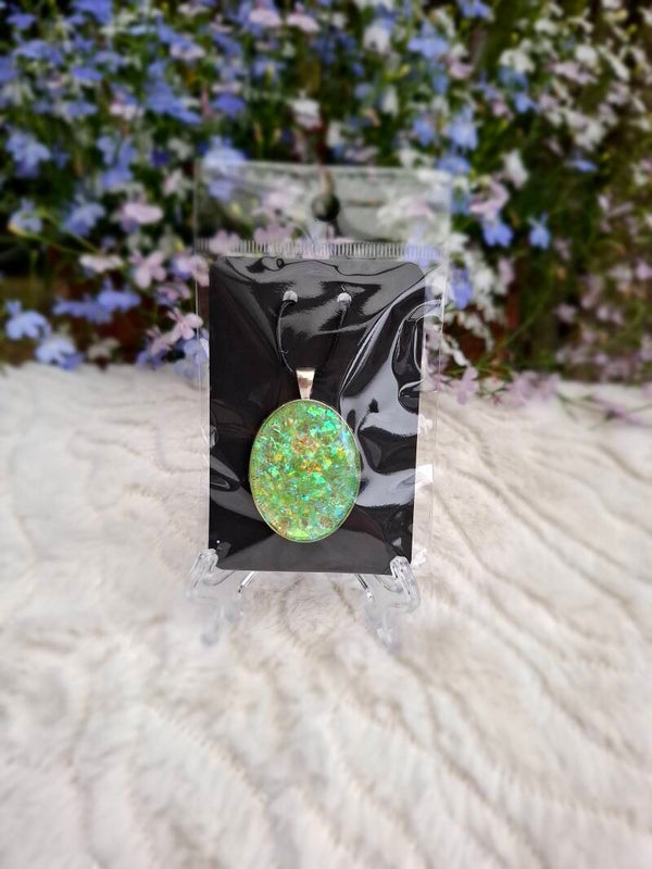 Beautiful resin necklace oval in shape, the necklace has been handmade with resin and green sliver craft foil. The necklace has a lovely shine. The necklace comes with black rope chain