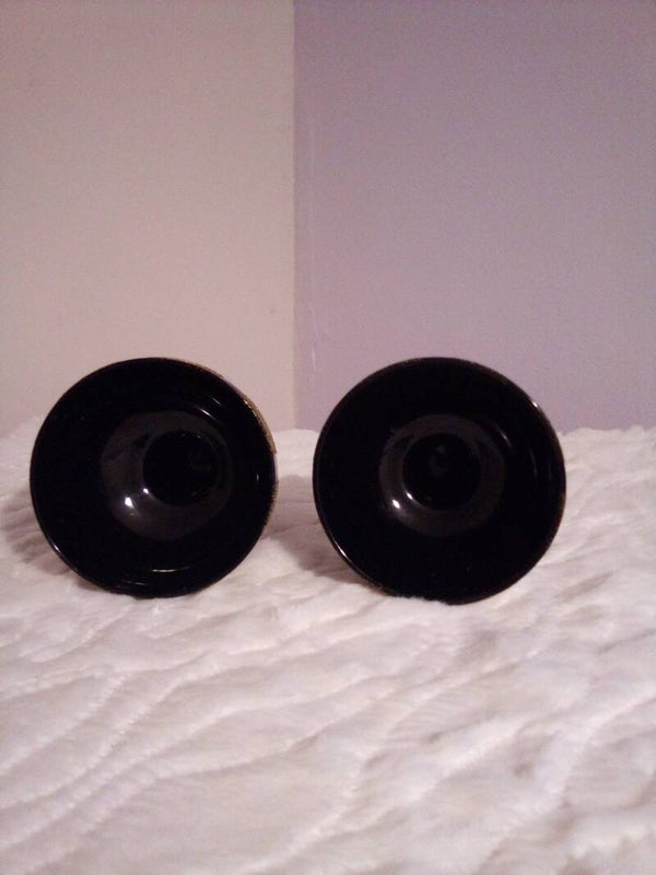 Two beautiful black candle holders with a sparkling golden design. The candle holder hold long thin candles. A set for any centre table setting.