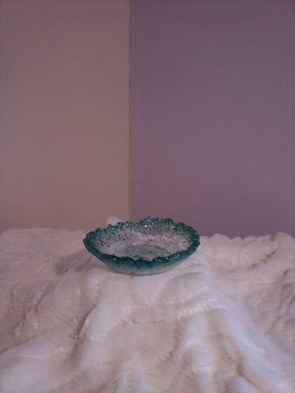 A lovely green glittery jewellery bowl.This bowl is handmade with resin and green glitter,this jewellery bowl has a beautiful sparkly look. A great gift for a family member or treat yourself.
