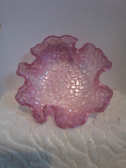 Beautiful resin fruit bowl. This fruit bowl is different shades of pink. The sides are curved in a shape of a flower petal. This item would look amazing on a side or kitchen table.